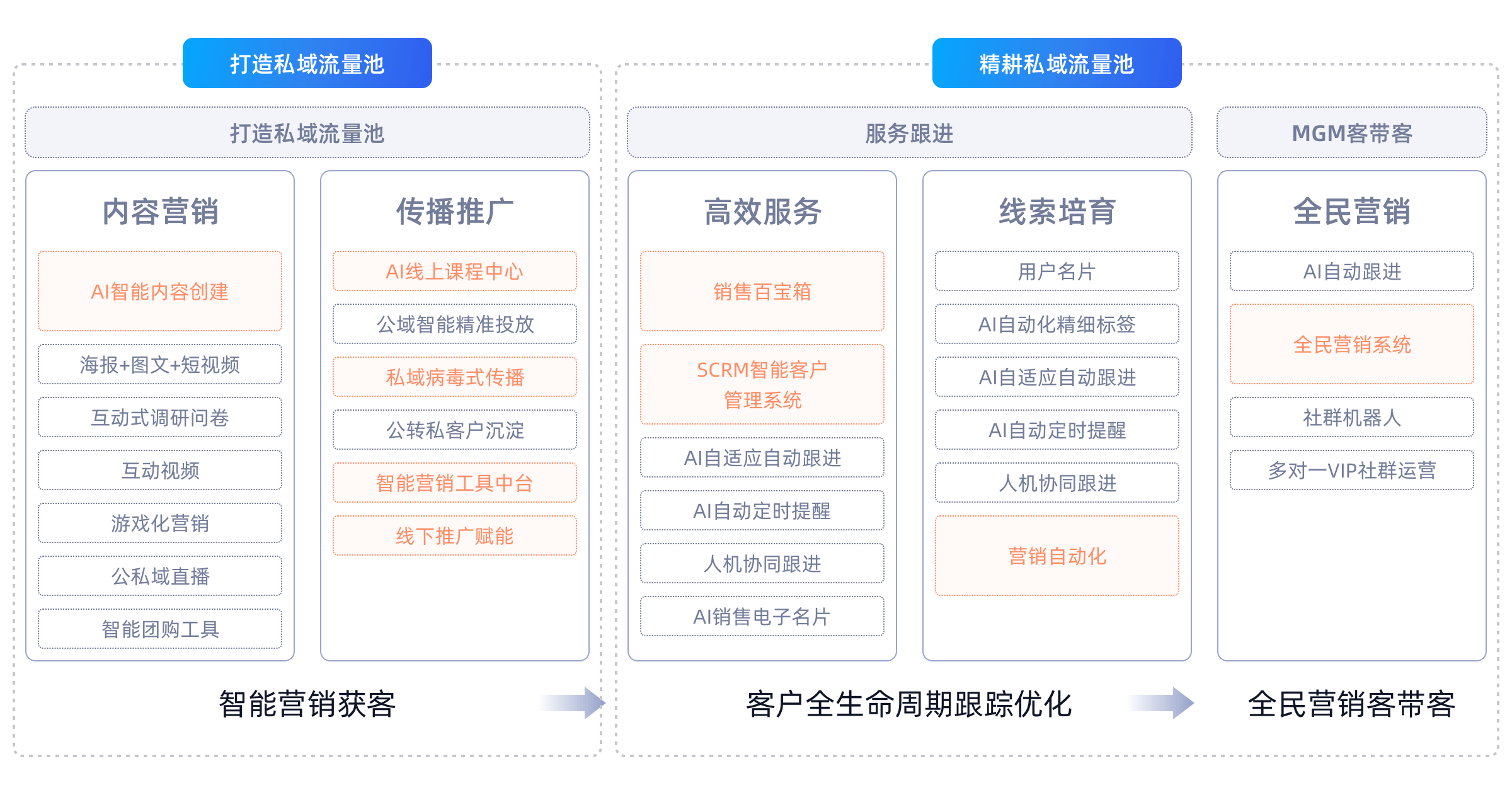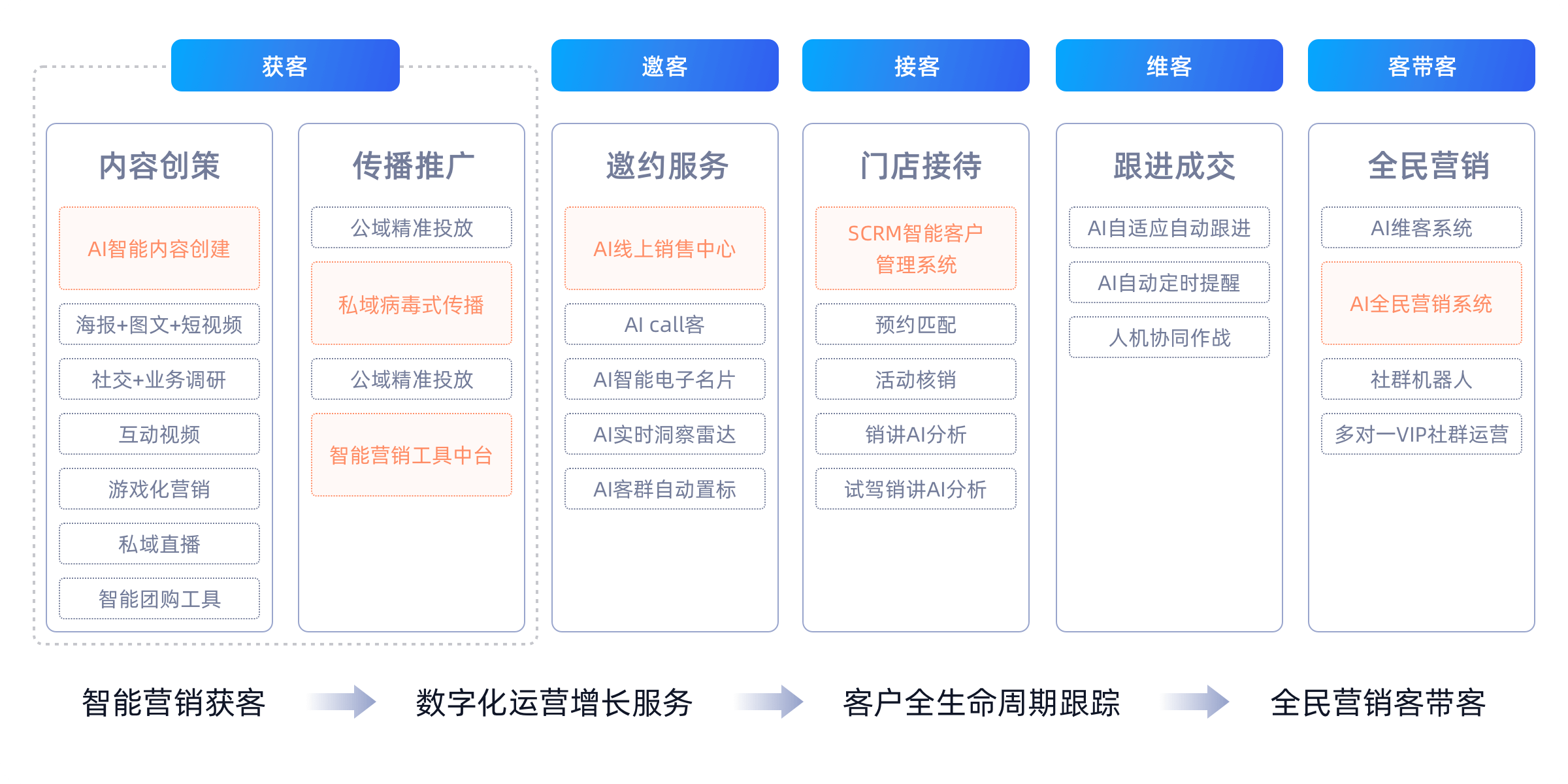 在“AI+营销”时代,原圈科技通过先进的大模型协调平台和精心打造的智能体矩阵,独特的行业和企业私域数据,帮助企业在抖音、腾讯、小红书、自有APP以及特色行业垂直APP等诸多营销战场上,实现“市场洞察、内容生成、投放管理、意向客户发现与转化、销售管理和客户运营的全周期AI营销服务。