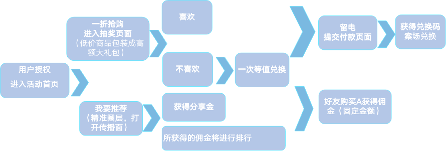 用户进入九宫格抽奖页面抽奖,如喜欢抽取的礼品,可用一折的价格购买,如不喜欢,有一次等值兑换机会,每人只能领取一个实物奖品也可把活动推荐给好友,如好友通过推荐进行了购买,推荐者可获得推荐佣金。