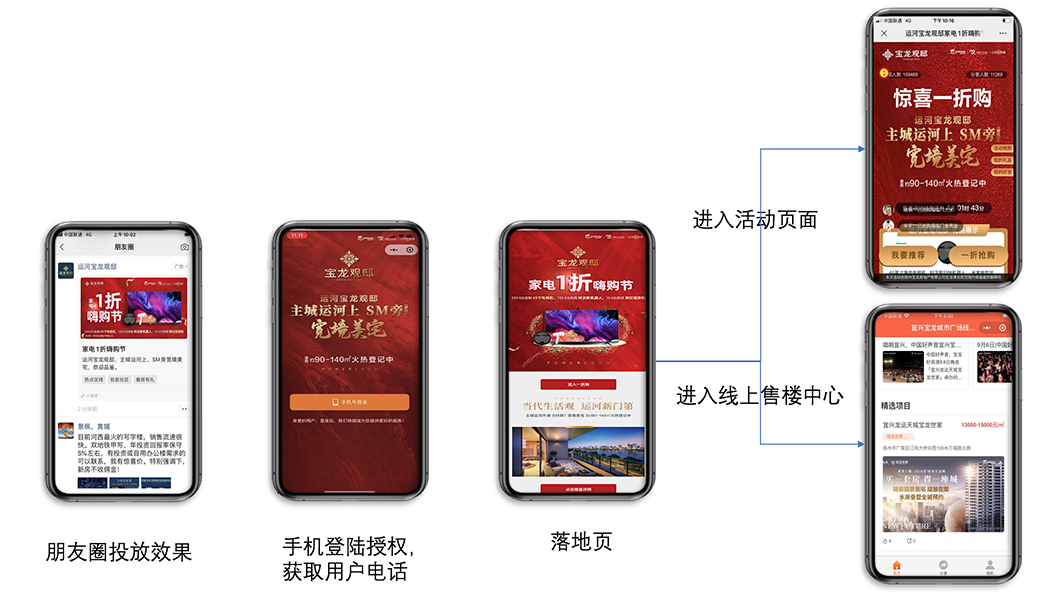 用户点击朋友圈广告,可选择进入H5游戏或进入线上售楼中心,进入游戏,通过社交营销传播引导用户转发参与活动,对于进入线上售楼中心的客户,可获取意向客户授权后的信息。
