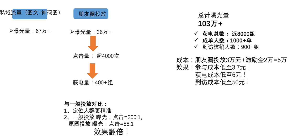 通过私域意向客户的画像,筛选出项目的意向客户标签,根据意向标签来选定投放人群条件,实现更精准的投放,转化效果更好。私域第一天至第三天的用户参与量达到11万+人次,第三天后根据之前意向客户标签投放朋友圈广告,以游戏化互动与项目信息展示相结合的方式进行投放,公域曝光36万;获得点击量4000➕ ;留电408组;加上私域客户的社交营销传播总计获得留电近8000组。