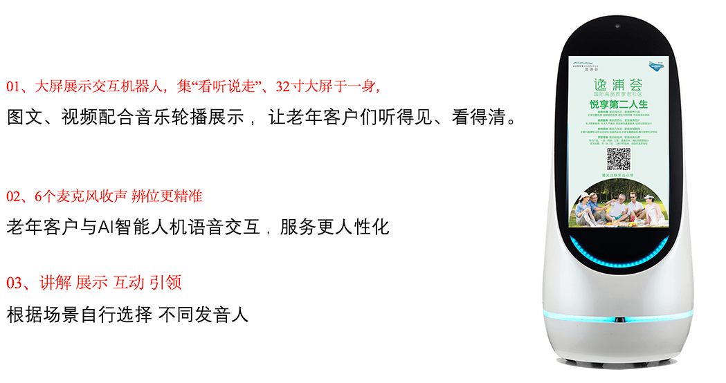 32寸交互大屏 更大信息量 、6麦克风收声 辨位更精准 、高低音双扬声器语音更清晰 、自主导航自主避障的AI机器人能打破现场营销的以上痛点。