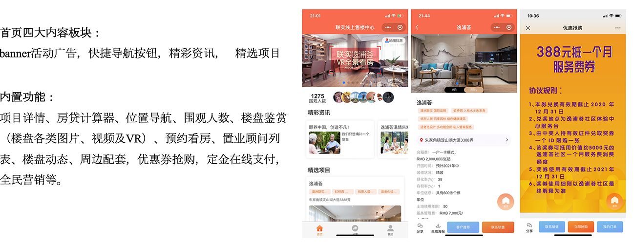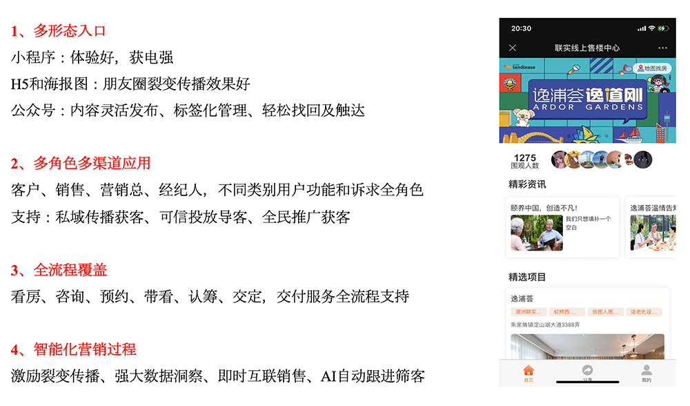 项目精彩展示,内容轻松替换,客户实时发现,销售精准对接,费效清晰衡量,覆盖营销服务全流程,多业态服务的客户线上一站式入口。