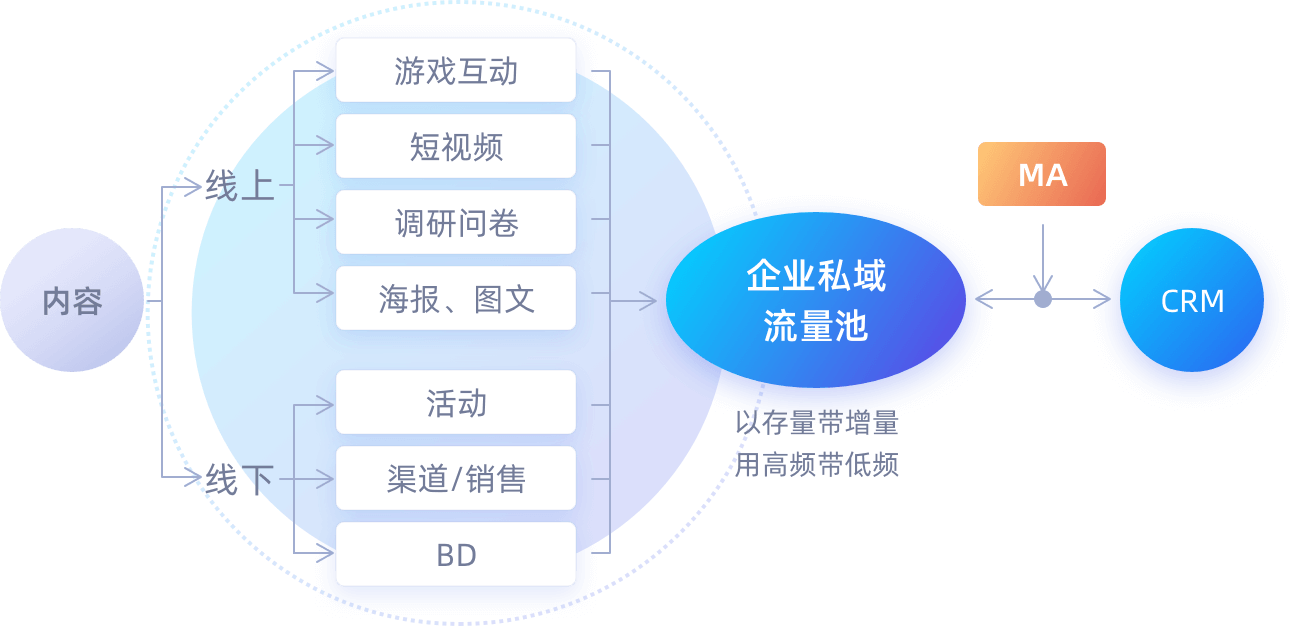 以社交端为核心,布局全渠道。打通公域平台,私域流量池和管理后台,全渠道获客营销,多渠道统一引导至微信管理,效果实时洞察,按营销效果付费,线上和线下融合的数字化,以存量带增量,以高频带低频。