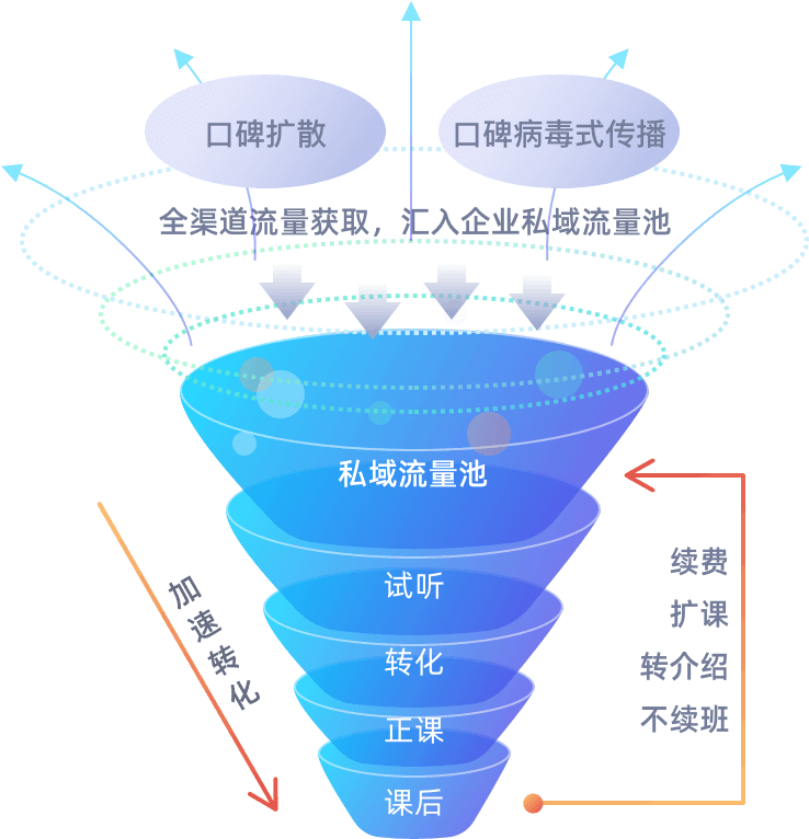 通过线索 培育,加快转化,同步将续费/扩课/转介绍/不续班的学生再纳入私 域流量池中。