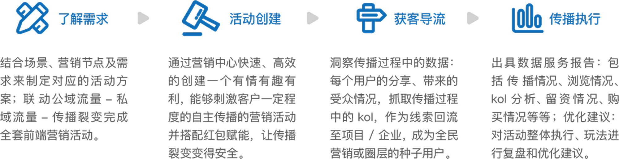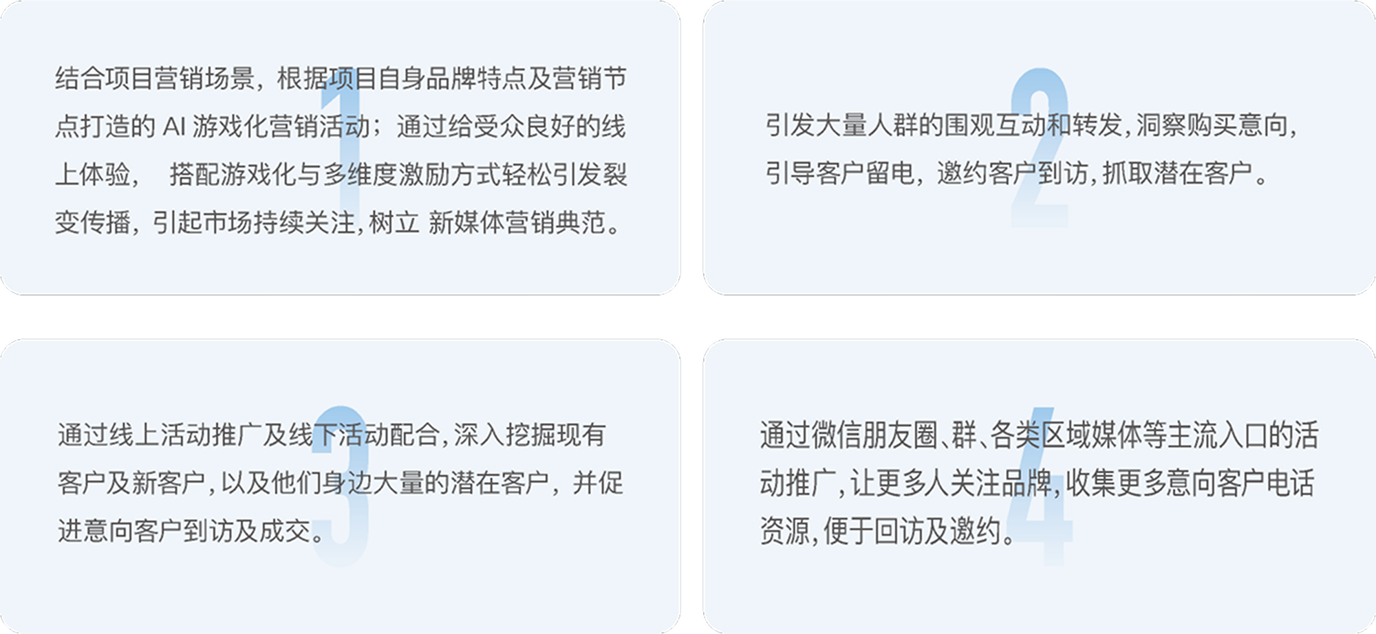 营销从来都不是平均发力,在企业营销节点及重要节日节点。 您需要兼具创意趣味,新颖玩法和强大传播导流能力的营销活动来打爆圈层,全城皆知。 原圈通过新颖的玩法和有效的激励可以迅速 在特定城市目标客群里大量传播覆盖, 同时把意向客户从线上向销售现场导流。真正做到有调性,有口碑, 有效果!